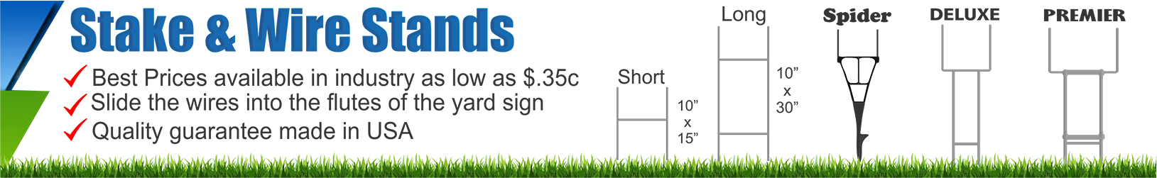 Stakes or wire stands are constructed in gauge steel or a strong plastic with two lap welded cross bars, fits most comonly coroplast yard signs sizes. Insert directly into the signs from the bottom. Use 1 stand per yard sign size 24″ x 9, 18″ x 12″, 24″ x 18″ and 36″ x 24″. On bigger yard signs we recommend to use 2 wire stands for best holding.